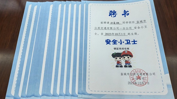 活動最后,車隊向孩子們頒發(fā)了“安全小衛(wèi)士”聘書,正式聘請他們成為安全監(jiān)督員,持證上崗的他們將在日常生活中對駕駛員父母進行“安全叮囑”和“詢問監(jiān)督”。