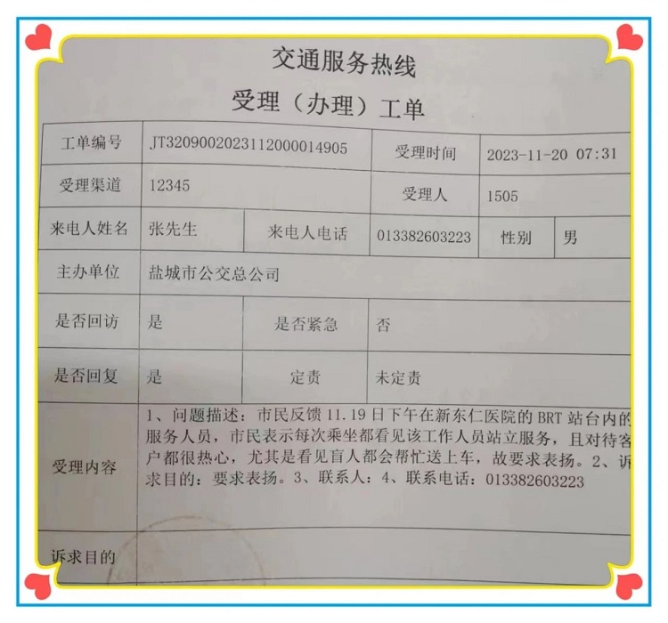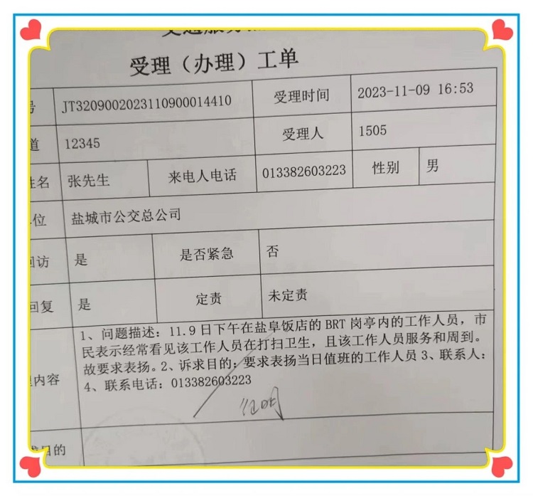11月9日,表揚(yáng)鹽阜飯店BRT站務(wù)員,經(jīng)常在站臺(tái)打掃衛(wèi)生且服務(wù)周到。