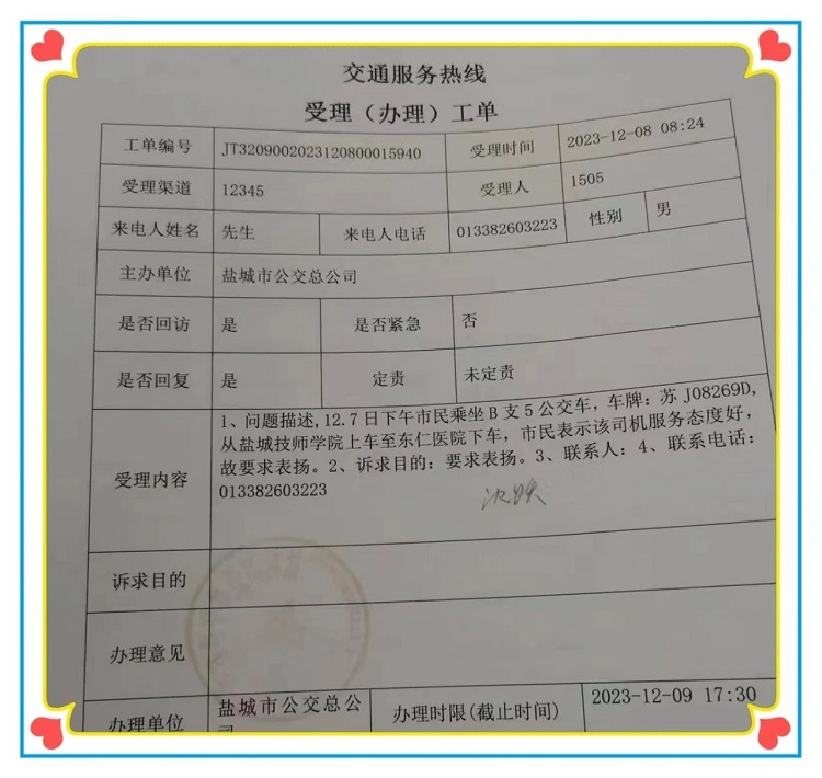 12月7日,表揚(yáng)下午乘坐的B支5線蘇J08269D號(hào)車駕駛員,服務(wù)態(tài)度好。