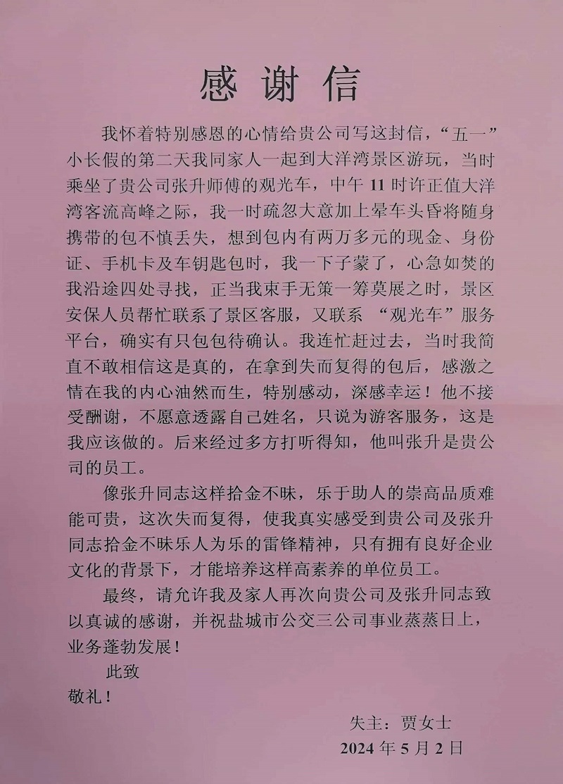 賈女士在感謝信中寫道:“像張升這樣拾金不昧、樂(lè)于助人的崇高品質(zhì)難能可貴,這次失而復(fù)得,使我真實(shí)感受到貴公司及張升同志拾金不昧助人為樂(lè)的雷鋒精神,只有擁有良好企業(yè)文化的背景下,才能培養(yǎng)這樣高素質(zhì)的單位員工!