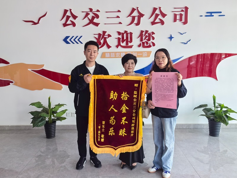 5月8日上午,市民賈女士專門驅(qū)車到市公交公司高鐵站公交停車場(chǎng),送來(lái)一面印有“拾金不昧 助人為樂(lè)”的錦旗和一封話語(yǔ)樸實(shí)但飽含真情的感謝信,當(dāng)面感謝39路線路班長(zhǎng)、駕駛員張升拾金不昧的善舉,同時(shí)點(diǎn)贊培養(yǎng)出高素質(zhì)優(yōu)秀駕駛員的鹽城公交。