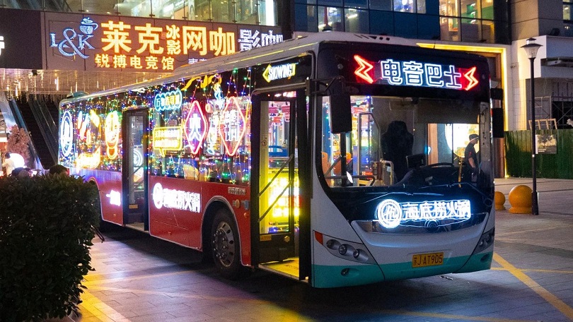 裝飾后的“電音巴士”,在車輛顯著位置張貼了“電音巴士”的字樣,車身還裝有顏色各異的氛圍燈,車內(nèi)配備各種燈光設(shè)備、調(diào)音臺、音響設(shè)備,播放著動感音樂,吸引不少年輕人打卡點(diǎn)贊、拍照發(fā)朋友圈。