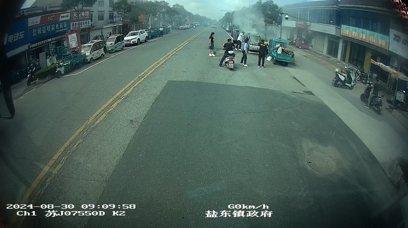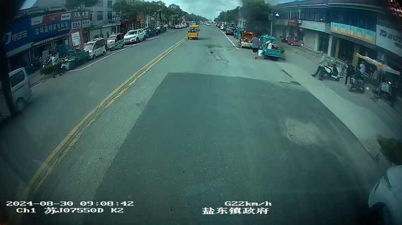 8月30日上午9時8分許,K2線駕駛員楊銀剛像往常一樣駕車執(zhí)行運營任務(wù),途經(jīng)鹽東鎮(zhèn)政府站臺附近時,發(fā)現(xiàn)前方一輛停放在路邊的電動三輪車正在猛烈燃燒并伴有大量濃煙。車主夏先生正試圖用水撲救,但效果并不明顯。眼看火情就要殃及周邊的多輛電動三輪車,情況十分危急。