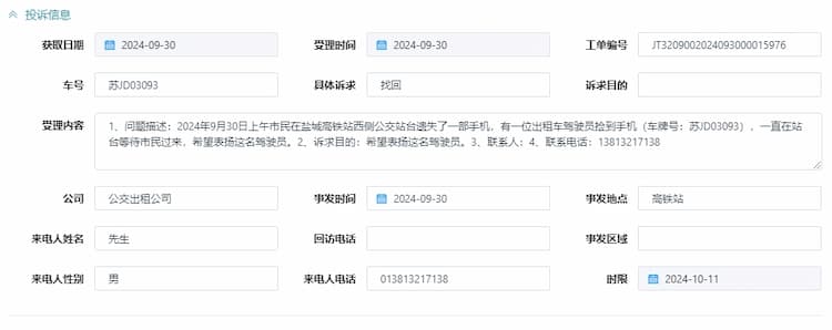 10月8日,公交出租汽車(chē)公司接到市交通運(yùn)輸服務(wù)中心轉(zhuǎn)來(lái)的12345政務(wù)熱線表?yè)P(yáng)工單,市民倪先生感謝公交出租汽車(chē)駕駛員葛開(kāi)峰師傅拾金不昧、樂(lè)于助人。