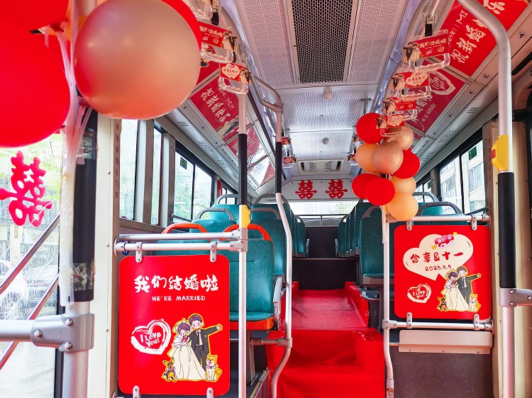 當(dāng)天,一輛車身印有醒目“囍”字和新人姓名的紅色公交婚車緩緩駛過城區(qū)。車頭LED屏滾動播放由“琴瑟和鳴”開往“永結(jié)同心”的520專線字樣,車窗貼滿傳統(tǒng)剪紙喜花,車內(nèi)裝飾了眾多婚禮喜慶元素,營造出溫馨浪漫的氛圍。