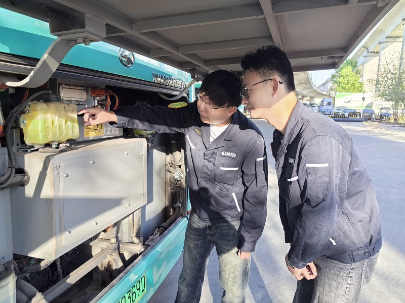 5月1日清晨,當(dāng)?shù)谝豢|陽(yáng)光灑向大地時(shí),師徒倆早早地來(lái)到華健物流園公交樞紐。在完成酒精檢測(cè)、血壓測(cè)量以及常規(guī)的班前叮囑后,他們仔細(xì)地對(duì)車輛進(jìn)行了例行檢查,從剎車系統(tǒng)到輪胎氣壓,從燈光照明到車廂衛(wèi)生,每一個(gè)細(xì)節(jié)都不放過(guò),確保車輛以最佳狀態(tài)投入運(yùn)營(yíng)。“入行第一天,我的師父就是這樣教我的,一定要做好出車前的檢查工作,這不僅是對(duì)乘客負(fù)責(zé),更是對(duì)我們自己負(fù)責(zé)。”程楊再次向李江廈說(shuō)道。