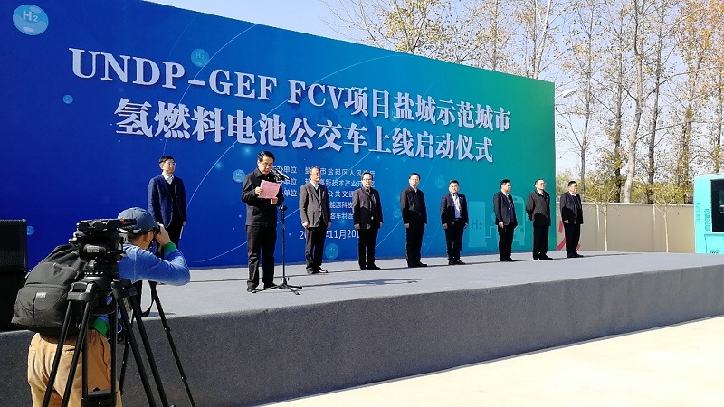 11月20日,氫燃料電池公交車上線啟動儀式在鹽城創(chuàng)詠加氫站公交回車場舉行,市長曹路寶出席,并乘車體驗。這是我市開通的首條氫能公交示范線路,首批投放10臺車在K11線運營。