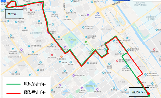 調(diào)整后沿途停靠站點:市一院、先鋒國際(單向)、泰山廟(單向)、商業(yè)大廈(魚市口)、鹽阜人民商場、迎賓橋、怡景花園城、市人民銀行、市氣象局、迎賓路騰飛路口(單)、迎賓路鹽南東路口(單)、迎賓路康樂路口、錢江方洲(東)、寶龍城市廣場、東進路美食街、公園道1號、大宇花苑、金融城、商業(yè)街開放大道口、興業(yè)路口、新河小學(xué)、高新技術(shù)園、鹽城市旅游集散中心、新河家園、新園路新都路口、新園路聚亨路口、新園路鹽瀆路口、鹽瀆路文港路口、新墩花園、億德包裝、盛大冷庫。