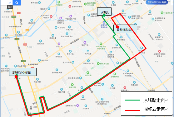 調(diào)整后不再停靠:火車站、鹽城汽車客運站(東)、新河家園、新園路新都路口、新園路聚亨路口、 新園路鹽瀆路口,增設(shè)站點:鹽城高鐵站、新豐社區(qū)、工學(xué)院(西門)、師范學(xué)院新長校區(qū)(西門)、東郊迎賓館、市委黨校、悅達天山水岸。