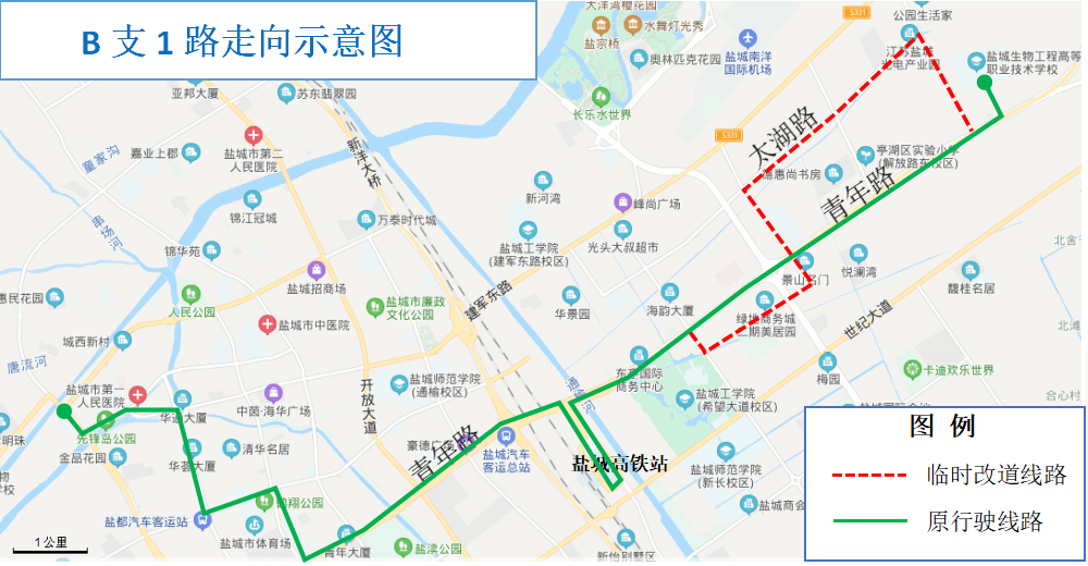 B支1線(xiàn)路走向:西環(huán)路、毓龍路、建軍西路、鹽馬路、大慶路、解放路、青年路、運(yùn)河路、青年路、生物工程學(xué)校。