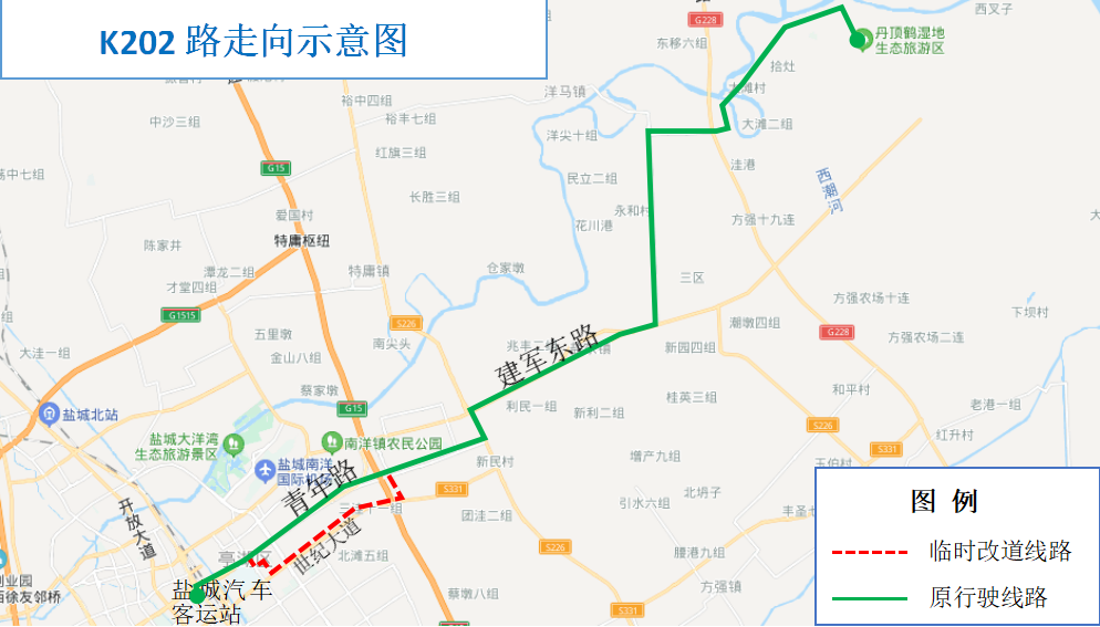 K202線(xiàn)路走向:鹽城汽車(chē)客運(yùn)站回車(chē)場(chǎng)、青年路、環(huán)保大道、S226、建軍東路、鹽東鎮(zhèn)集鎮(zhèn)路、黃新線(xiàn)、丹鶴路。