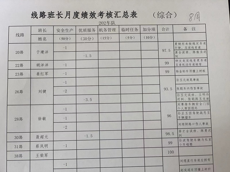 不斷梳理班組管理具體實(shí)施過程中存在的責(zé)任不明確、流程不清楚等問題,分別從安全生產(chǎn)、優(yōu)質(zhì)服務(wù)、機(jī)務(wù)管理、臨時任務(wù)等方面考核,明確每個項(xiàng)目的扣分標(biāo)準(zhǔn)及加分項(xiàng)。每月進(jìn)行考核評分,明星線路按照匯總數(shù)據(jù)評選。