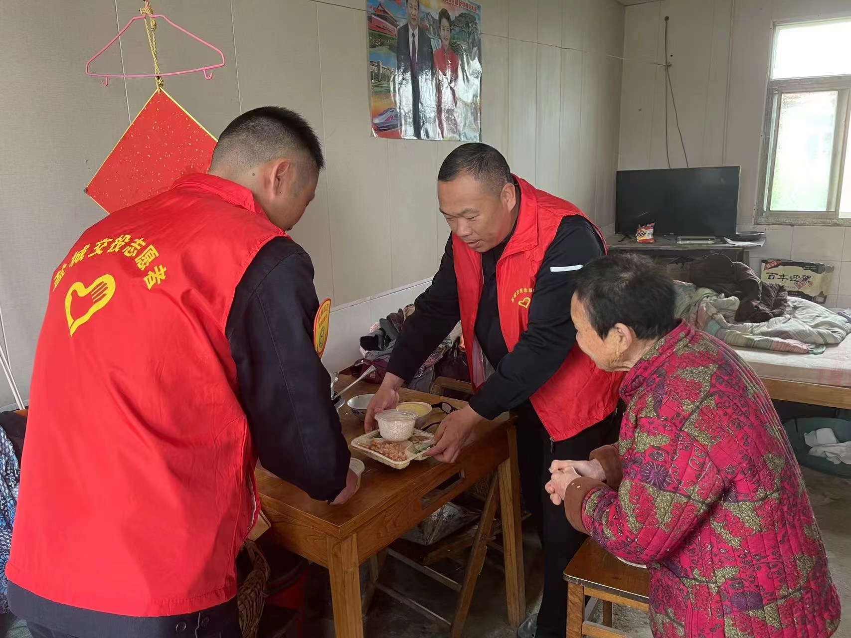 志愿者們準(zhǔn)備好三葷兩素一湯的豐盛午餐,還有餐后水果,用一次性飯盒裝好,送到每個(gè)老人的手中。