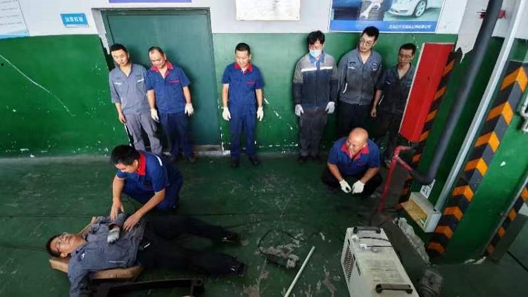 演練中,修理工突然觸電倒地,修理班長發(fā)現(xiàn)后,立即大聲呼救,并第一時間迅速切斷電源,讓觸電人員徹底與電流斷開,防止事故危害擴(kuò)大。隨后修理班長撥打120急救電話, 隨即采取“心臟胸外擠壓法”和“人工呼吸法”對觸電人員進(jìn)行急救,觸電人員經(jīng)搶救終于恢復(fù)心跳和呼吸;謴(fù)心跳和呼吸后,為防止繼發(fā)休克或心衰,讓觸電人員保持平躺姿勢觀察其精神狀態(tài),等待救護(hù)車到來。