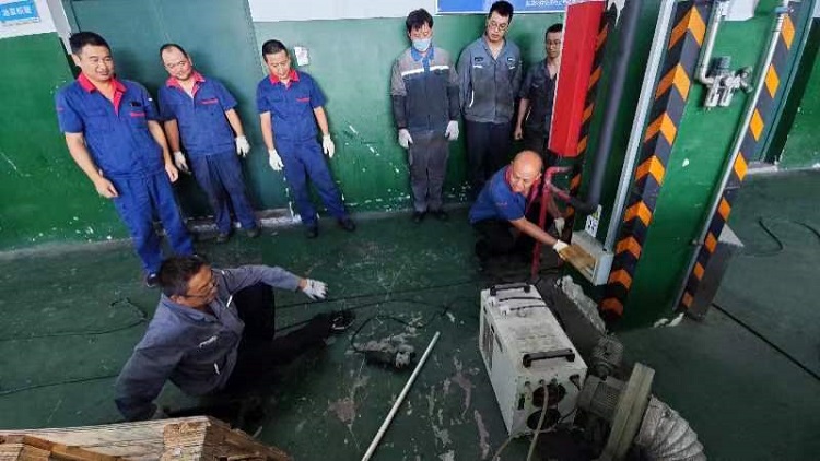 演練開始前,修理公司安全副經(jīng)理孫超強(qiáng)調(diào)了演練注意事項,要求演練人員嚴(yán)格按照預(yù)案進(jìn)行演練。此次演練模擬了修理人員在車間進(jìn)行切割作業(yè)時,由于電源線老化導(dǎo)致絕緣皮破損引起配電箱帶電,一名修理工在打開配電箱時觸電倒地的危急情況處理。
