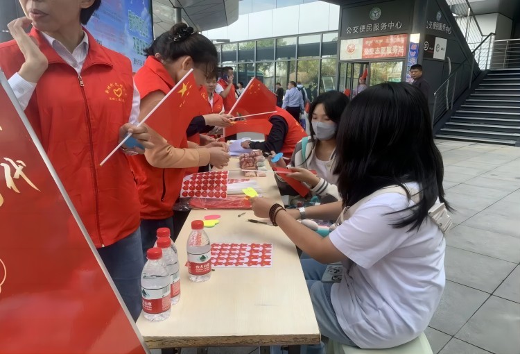 當天一大早,身穿紅色馬甲的志愿者們來到了人頭攢動高鐵站西廣場,向往來的旅客宣傳黨的二十大精神和新時代十年的經(jīng)濟成就,F(xiàn)場輪番播放《歌唱祖國》等歌頌祖國的愛國主義歌曲,吸引了許多乘客駐步聆聽,不少人不由自主地跟著哼唱起來,大家的民族自豪感油然而生。紅色馬甲與國旗交相呼應,為節(jié)日里的高鐵站增添了一抹喜慶氛圍。